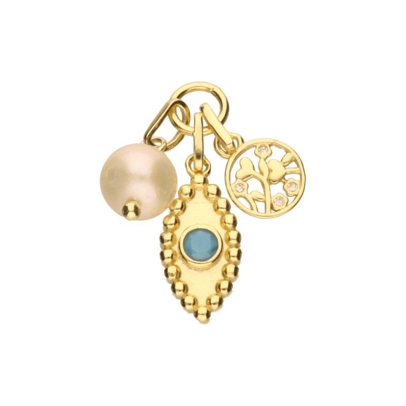 ANHÄNGER MIT DREI ELEMENTEN, 925 SILBER VERGOLDET MIT 24 KARAT GOLD, WEISSER ZIRKONIA, TÜRKIS, PERLE MIT EINEM DURCHMESSER VON 6 mm, AUGE 13 mm X 7 mm, DURCHGESTELLTER LEBENSBAUM MIT EINEM DURCHMESSER VON 8 mm, HERZEN.