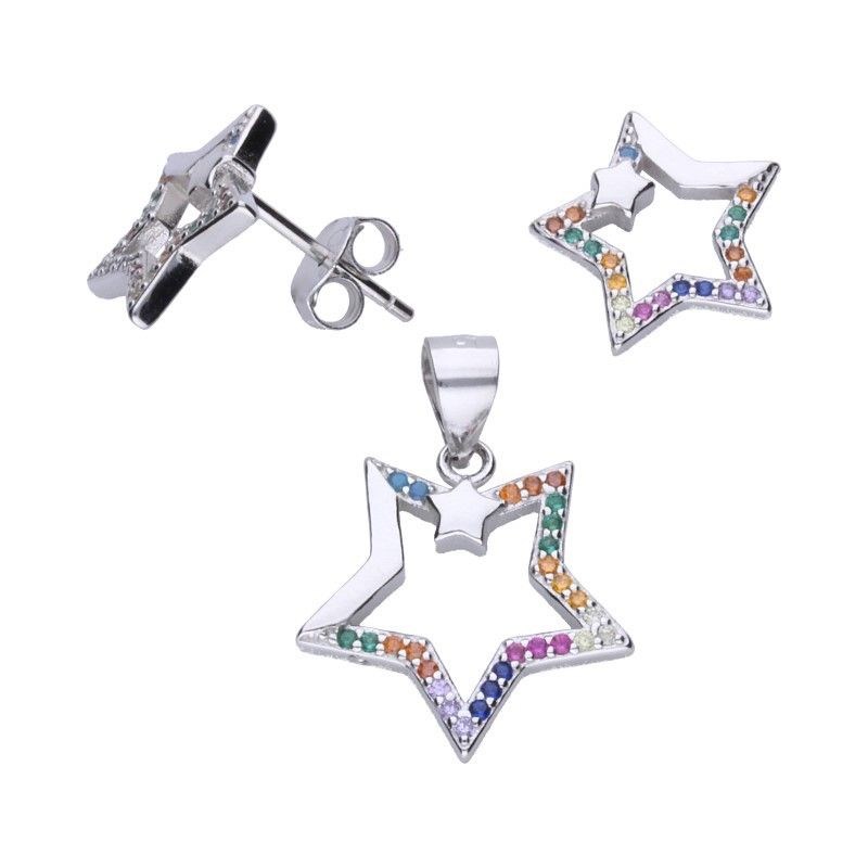 SET AUS OHRSTECKER UND ANHÄNGER, 925 SILBER RHODINIERT, STERNE, BUNTES ZIRKONIA, ANHÄNGERABMESSUNGEN OHNE BAND 15 mm X 16 mm.
