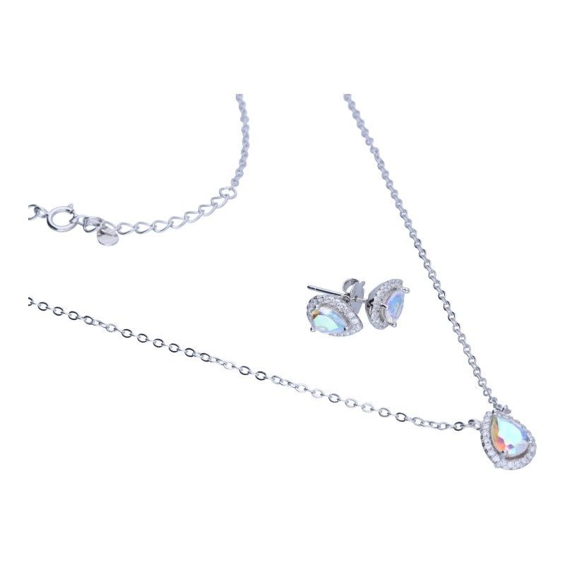 MARQUIS-TYP-SET, STAB-OHRRINGE PLUS ANHÄNGER, 925er SILBER RHODIUMBESCHICHTET, HALSLÄNGE 42 cm + 3 cm VERLÄNGERUNG, OPAL-ZIRKONIA MIT ZENTRALEM ZIRKONIA UND WEISSEM ZIRKONIA, TRÄNE, TROPFEN, OHRRINGABMESSUNGEN 9 mm x 6 mm.