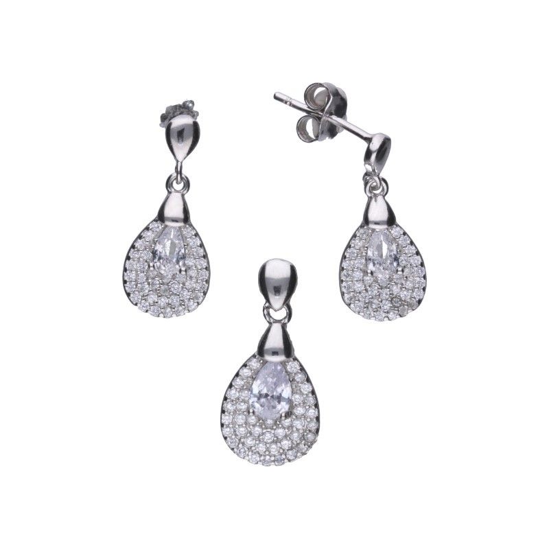 SET, HÄNGENDE OHRSTECKER UND ANHÄNGER, 925 SILBER RHODINIERT, WEISSER ZIRKONIA, TROPFEN, TRÄNE, ANHÄNGERABMESSUNGEN OHNE BAND 9 mm x 17 mm.