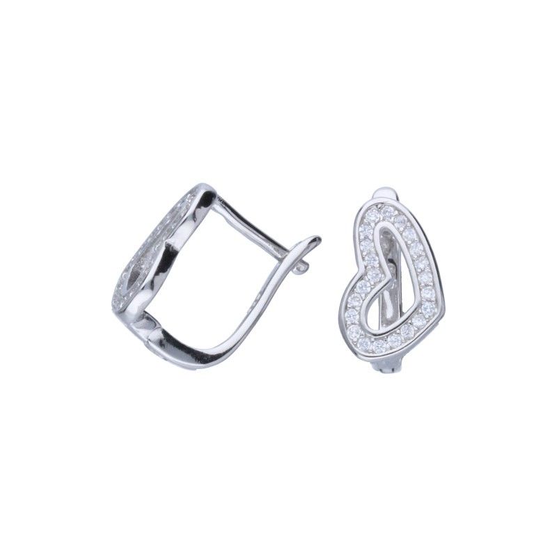 OHRRINGE MIT ENGLISCHER KLEMME, 925 SILBER, RHODINIERT, WEISSER ZIRKONIA, HERZEN, GRÖSSE 15 mm X 12 mm.