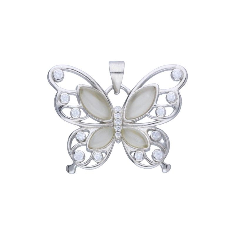 ANHÄNGER MIT WEISSEM PERLMUTT, 925er SILBER, RHODINIERT, WEISSER ZIRKONIA, DURCHGEBRACHTER SCHMETTERLING, GRÖSSE 20mmX30mm.