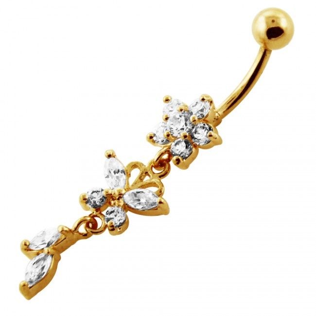 BAUCHRING, KOMBINATION AUS 925ER SILBER VERGOLDET MIT 24 KARAT GOLD UND CHIRURGENSTAHL, WEISSER ZIRKONIA, BLUME, SCHMETTERLING.
