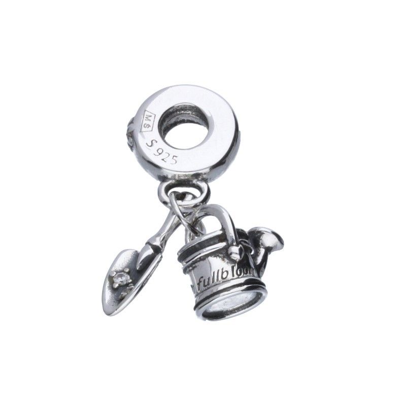PERLENHÄNGEANHÄNGER FÜR EIN MODULARES ARMBAND, DURCHMESSER 3 mm, 925er SILBER, RHODIUMBESCHICHTET, WEISSES ZIRKONIA, BLUMEN, BLUMEN, GIEßKANNE, SCHAUFEL.