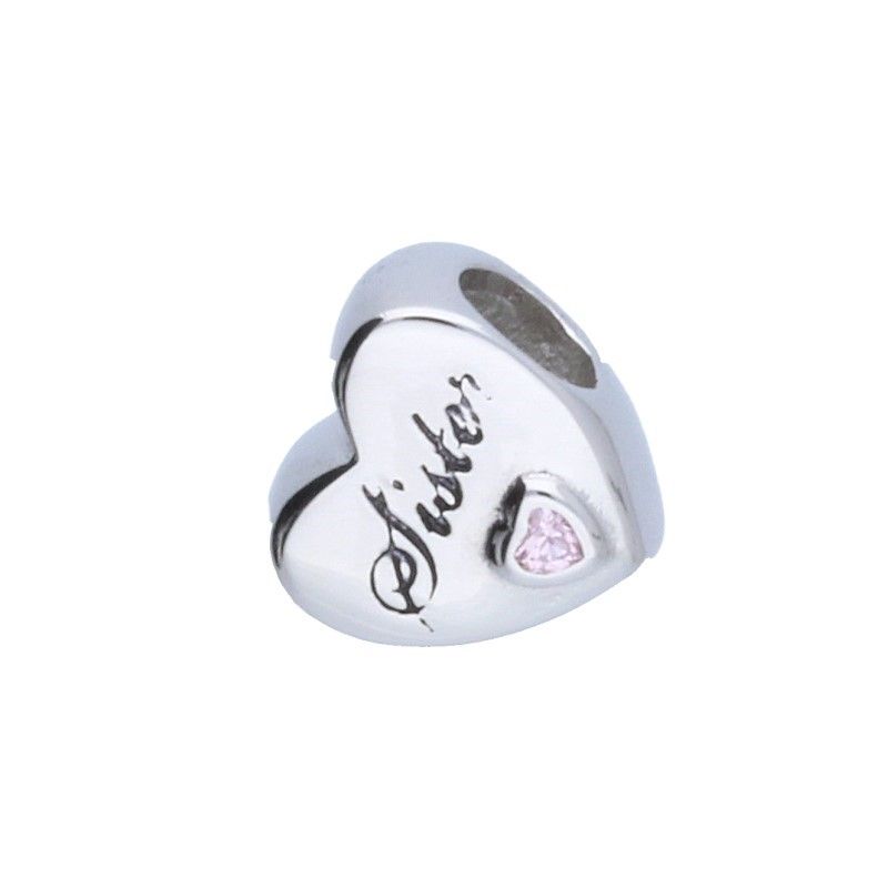PERLEN-ANHÄNGER, GEEIGNET FÜR MODULARE ARMBÄNDER MIT EINEM DURCHMESSER VON 3 mm, PERLE, 925 SILBER RHODINIERT, ROSA ZIRKONIA, HERZ MIT SCHWESTER-INSCHRIFT, ABMESSUNGEN 10 mm x 10 mm.