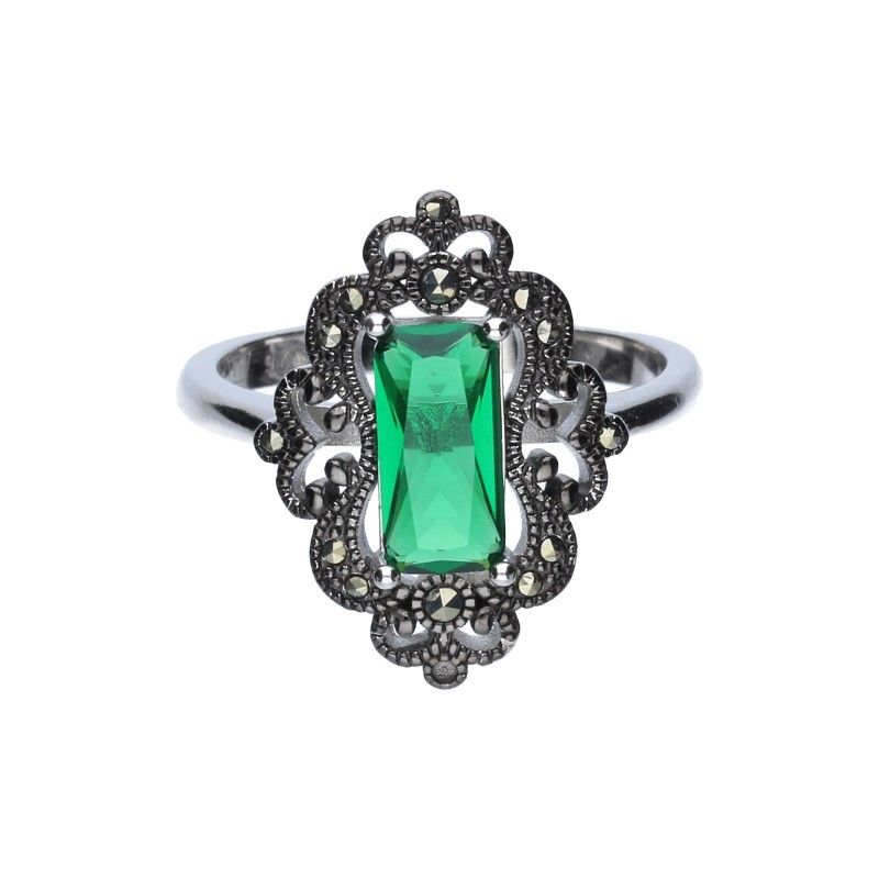 Durchbrochener Ring, 925er Silber, rhodiniert, Markasit, Smaragdfarbener Stein, Elementabmessungen 15 mm x 20 mm.