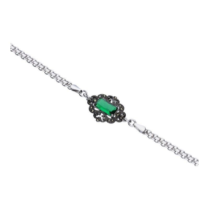 ARMBAND AN ZWEIREIHIGER BISMARCK-KETTE, 925er SILBER, RHODIUMBESCHICHTET, LÄNGE 18 cm + 5 cm VERLÄNGERUNG, MARCAsite, HAUPTSTEIN IN SMARAGDFARBE, DURCHGEBRACHTES MOTIV MIT ABMESSUNGEN 19 mm x 15 mm.