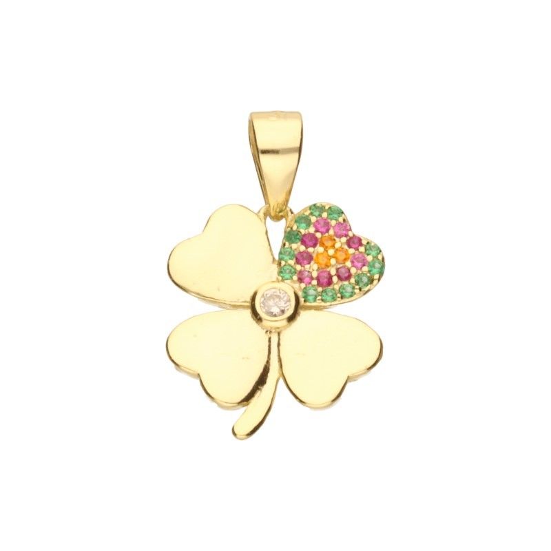 ANHÄNGER AUS 925-SILBER, VERGOLDET MIT 24 KARAT GOLD, BUNTEM ZIRKONIA, VIERBLÄTTIGEM KLEEBLATT, GRÖSSE 15 mm x 14 mm.