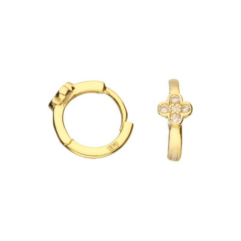 CREOLEN, 925 SILBER, VERGOLDET MIT 24 KARAT GOLD, WEIßEN ZIRKONEN, KLEEBLAU, OHRRINGDURCHMESSER 12 mm.