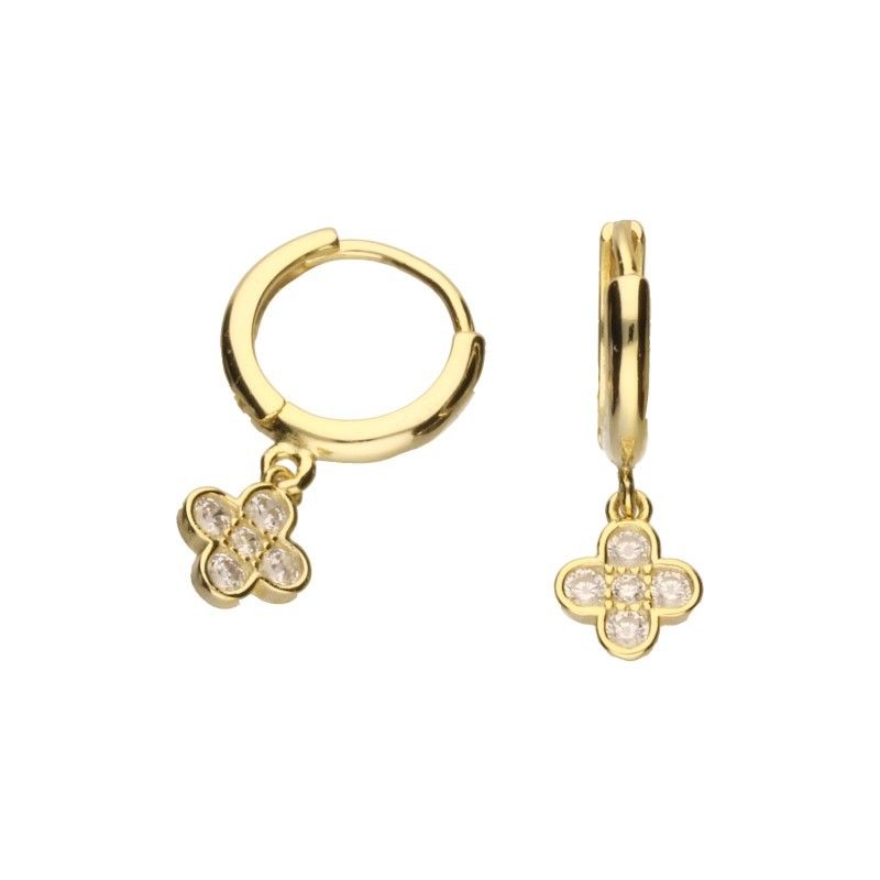 OHRRINGE MIT KLEEBLATT, 925 SILBER, VERGOLDET MIT 24 KARAT GOLD, WEISSER ZIRKONIA, RINGDURCHMESSER 12 mm.
