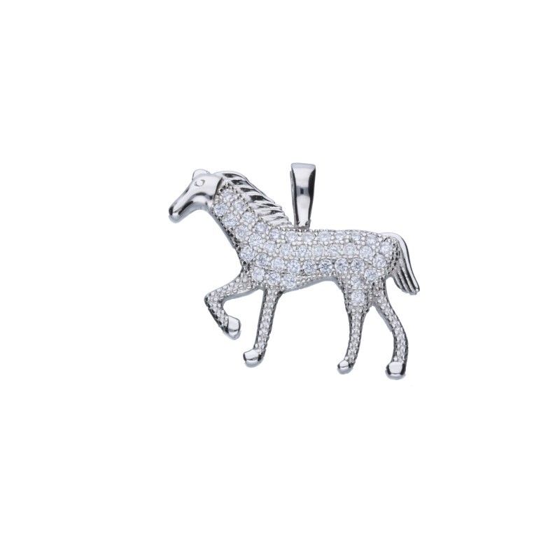 ANHÄNGER AUS 925er SILBER, RHODIUMBESCHICHTET, WEISSES ZIRKONIA, EINGEBETTET DURCH MIKROSETZUNG, PFERD, PFERD, PONY, GRÖSSE 21 mm x 23 mm.