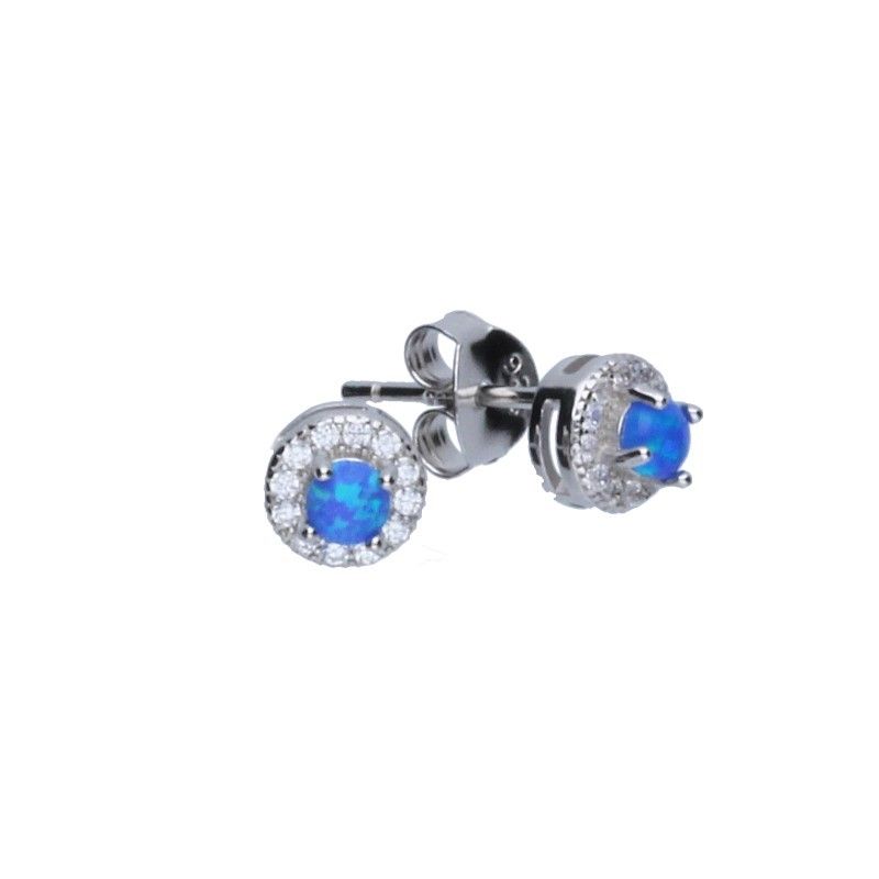 Filigrane Ohrstecker, 925er Silber, rhodiniert, blauer Opal, ringsherum weiße Zirkone, OHRRINGDURCHMESSER 6 mm.