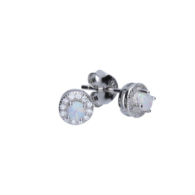 Filigrane Ohrstecker, 925er Silber, rhodiniert, weißer Opal, ringsherum weiße Zirkone, OHRRINGDURCHMESSER 6 mm.