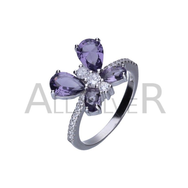 RING, 925er Silber, rhodiniert, weißer Zirkon, Hauptstein in Amethystfarbe, Schmetterling, Größe 12 mm x 15 mm.