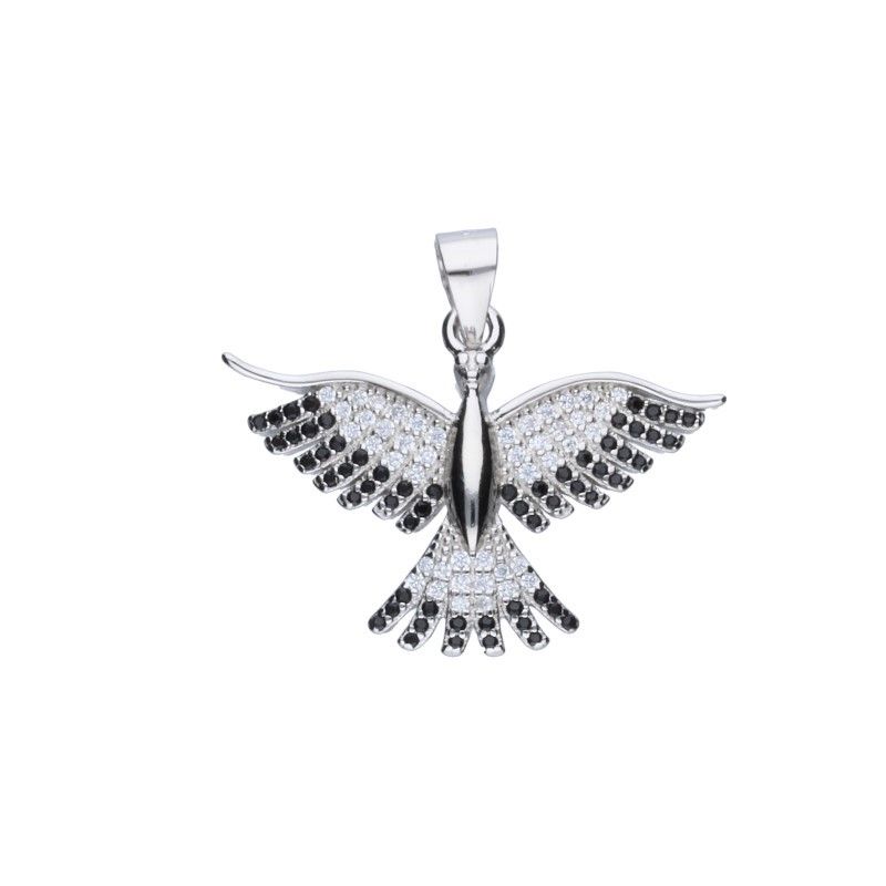 ANHÄNGER AUS SILBER 925, RHODIUMBESCHICHTET, WEISSER UND SCHWARZER ZIRKONIA, VOGEL, GRÖSSE 26 mm X 17 mm, OHNE KRAWATTE.