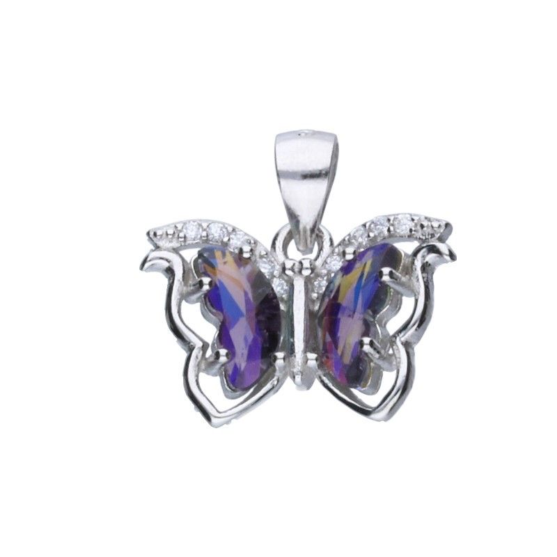 DURCHGEBUNDENER ANHÄNGER, 925er SILBER, RHODINIERT, MEHRFARBIGE STEINE, SCHMETTERLING, ABMESSUNGEN 12 mm x 17 mm, OHNE KRAWATTE.