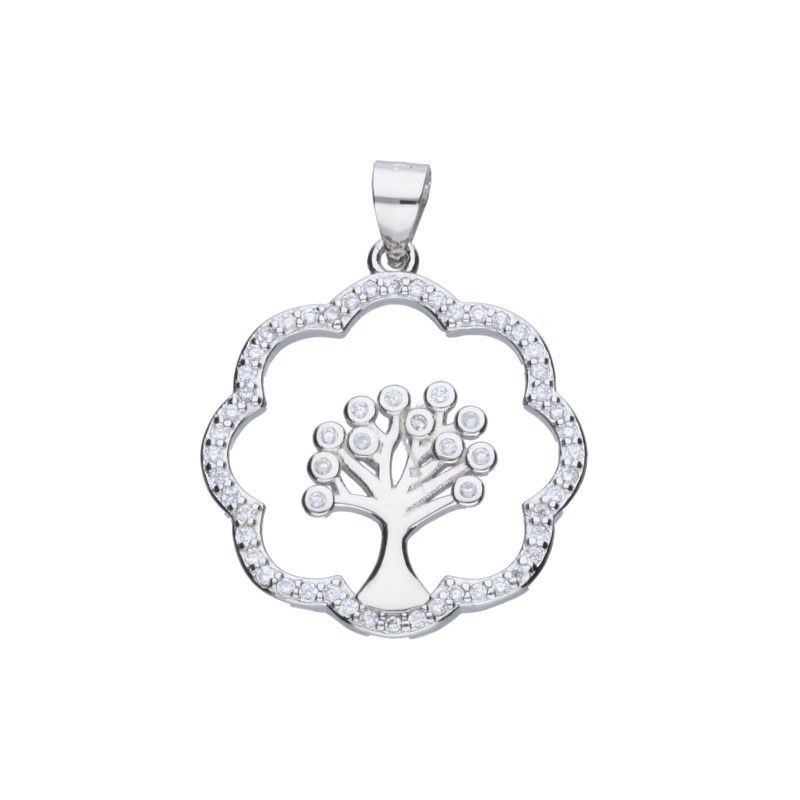 Durchbrochener Anhänger, 925er Silber, rhodiniert, weißer Zirkon, Lebensbaum, ANHÄNGERABMESSUNGEN 23 mm x 23 mm, OHNE BAND.