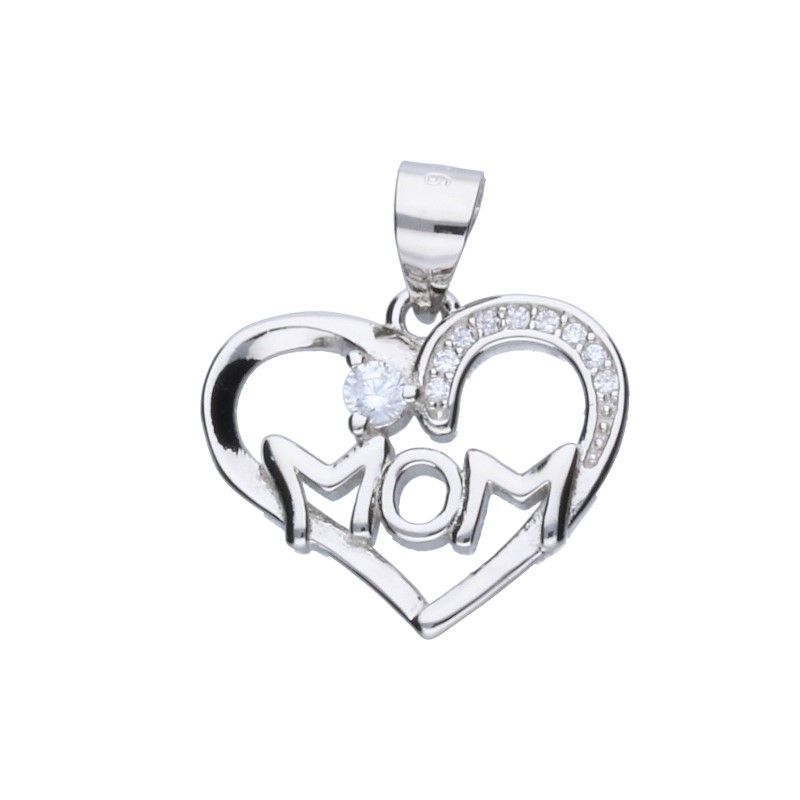 Durchbrochener Anhänger, 925er Silber, rhodiniert, weißer Zirkon, Herz mit der Aufschrift „Mom“, Größe 17 mm x 15 mm.