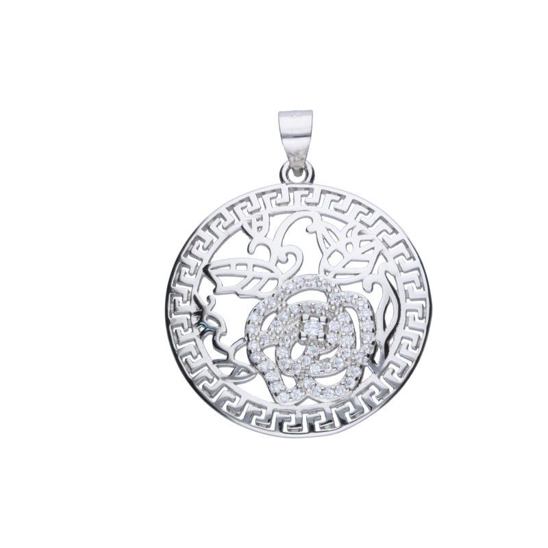 Durchbrochener Anhänger, 925er Silber, rhodiniert, weißer Zirkon, rosafarben, Anhängerdurchmesser 25 mm.