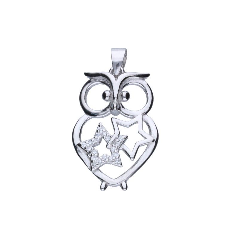 Durchbrochener Anhänger, 925er Silber, rhodiniert, weißer Zirkon, Eule, Größe 23 mm x 16 mm, ohne Krawatte.