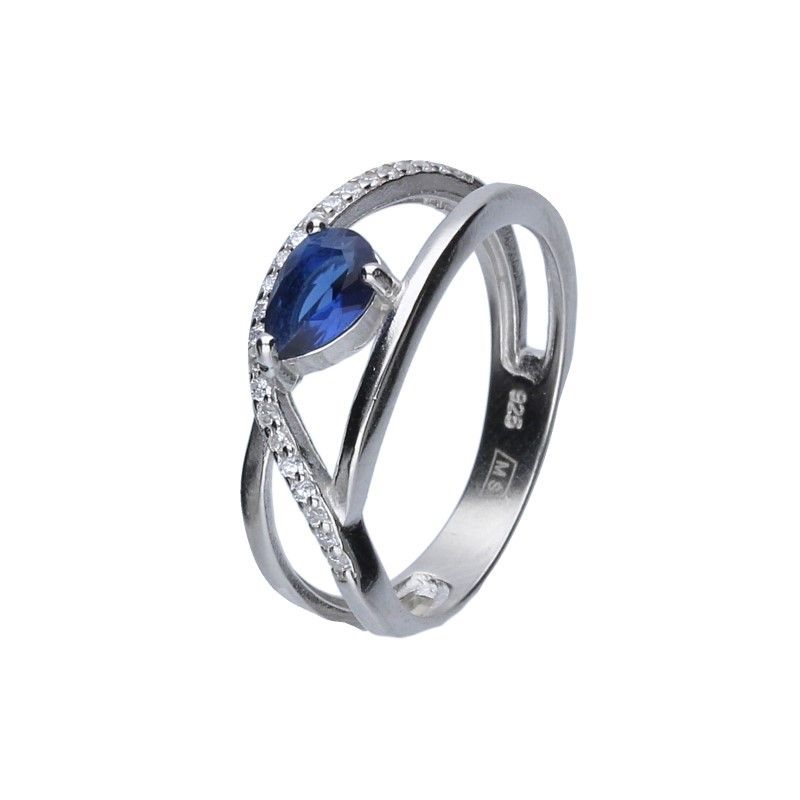 RING, 925 SILBER, RHODIUMBESCHICHTET, HAUPTZIRKONIA IN DER FARBE SAPHIR, FEINES ZIRKONIA IN WEISS, RINGBREITE 7 mm.