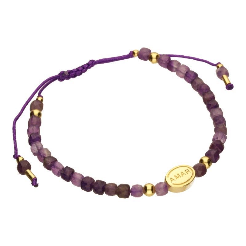 Armband an einer Schmuckschnur mit facettierten Natursteinen, Durchmesser 5 mm, in violetten Farbtönen, Elemente aus 925er Silber vergoldet mit 24 Karat Gold, Länge mit einer Schnur verstellbar, ovales Element mit der Aufschrift „AMAR“ mit Maßangaben 10 mm x 8 mm.< /p>