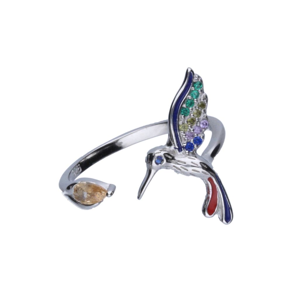 OFFENER RING, 925er SILBER, RHODINIERT, BUNTES ZIRKONIA, VOGEL, HUMBBING, ABMESSUNGEN 10 mm x 18 mm.