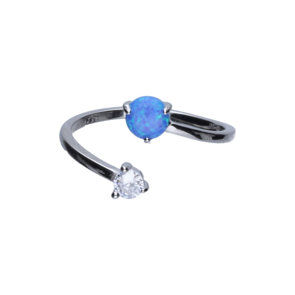 OFFENER RING, 925 SILBER, RHODIUMBESCHICHTET, BLAUER OPAL, 5 mm DURCHMESSER PLUS WEISSER ZIRKONIA, 3 mm DURCHMESSER.