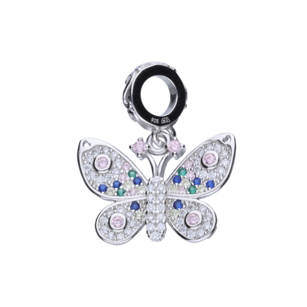 PERLENANHÄNGER, PASST ZU MODULARARMBÄNDERN MIT EINEM DURCHMESSER VON 3 mm, 925er SILBER, RHODIUMBESCHICHTET, BUNTES ZIRKONIA, SCHMETTERLING, GRÖSSE 19 mm x 14 mm.