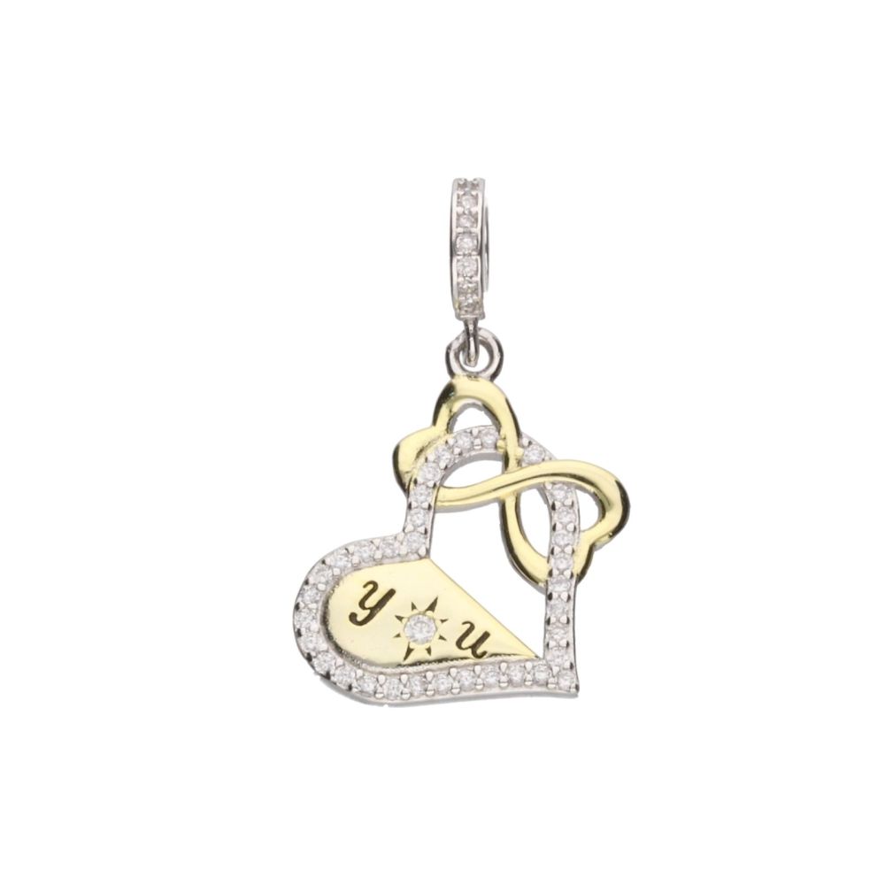 PERLENANHÄNGER, PASST ZU MODULARARMBÄNDERN MIT EINEM DURCHMESSER VON 3 mm, EINER KOMBINATION AUS 925er SILBER, RHODINIERT MIT 24 KARAT GOLD, WEISSEM ZIRKONIA, UNENDLICHKEIT UND EINEM HERZ MIT ABMESSUNGEN VON 15 mm X 18 mm.