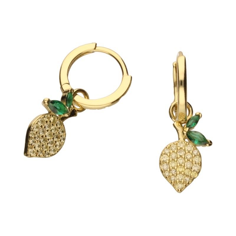 OHRRINGE AN EINEM RING MIT EINEM DURCHMESSER VON 11 mm, 925er SILBER, VERGOLDET MIT 24 KARAT GOLD, BUNTEM FEINEM ZIRKONIA, ZITRONEN, GRÖSSE 7 mm X 13 mm.