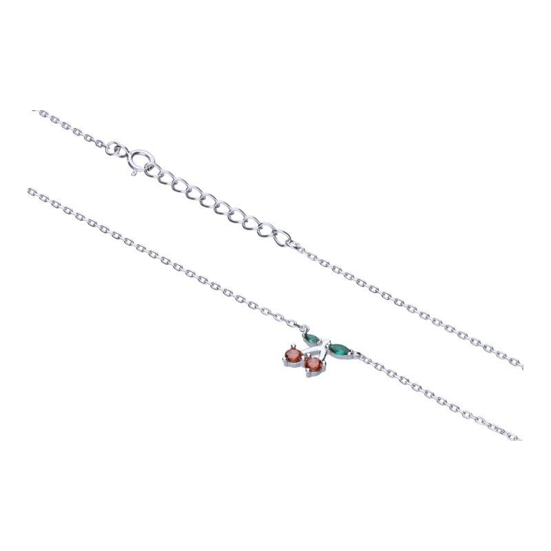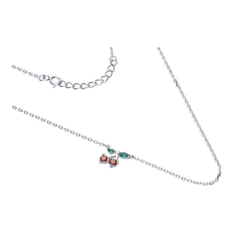 Halskette an einer Kette mit Zorngeflecht, 925er Silber, rhodiniert, Länge 42 cm + 3 cm Verlängerung, buntes Zirkonoxid, Kirschen, Größe 8 mm x 10 mm.