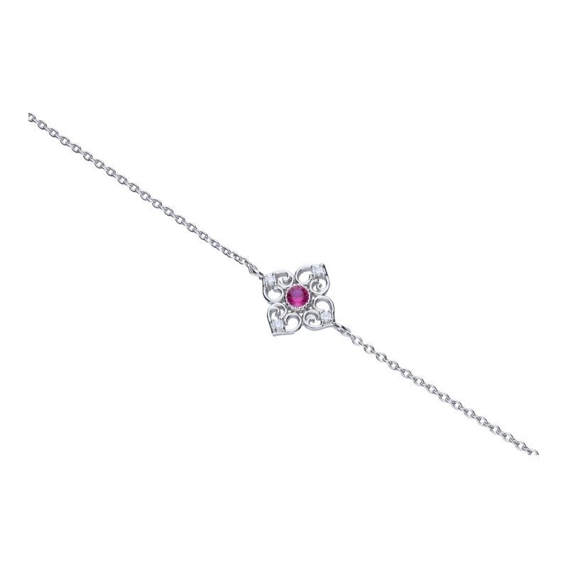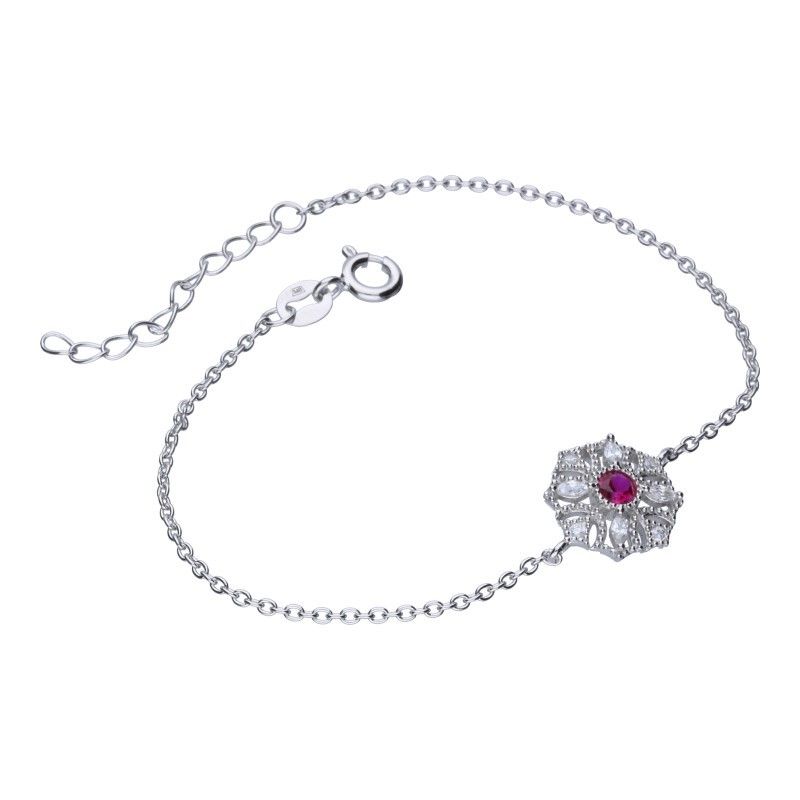 ARMBAND, 925er SILBER, RHODIUMBESCHICHTET, LÄNGE 16 cm + 3 cm VERLÄNGERUNG, FUCHSIA UND WEISSER ZIRKONIA, DURCHBROCHENES ELEMENT, GRÖSSE 10 mm x 10 mm.