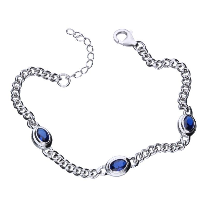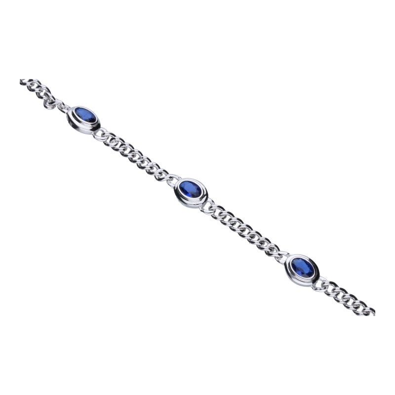 ARMBAND AN EINER RÜSTUNGSGEWEBEKETTE, 3,5 mm BREITE, 925er SILBER, RHOZO-BESCHICHTET, OVALE ZIRKONIEN IN SAPHIR-FARBE, ABMESSUNGEN 7 mm x 9 mm MIT RAHMEN, LÄNGE 17 cm + 3 cm.