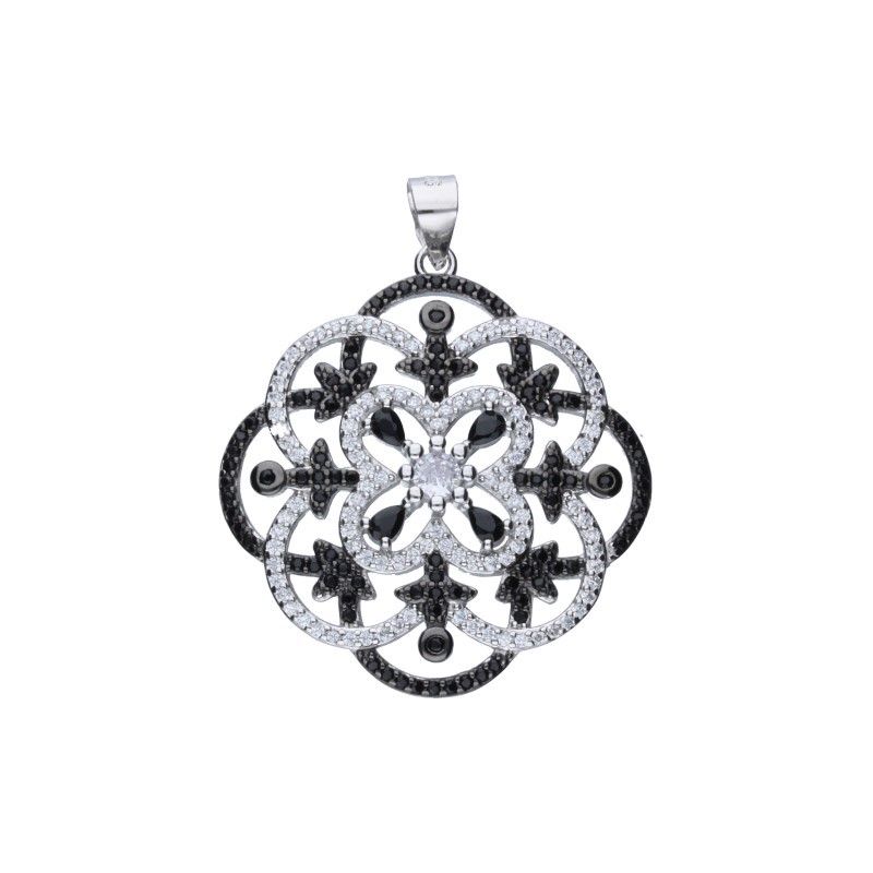 Durchbrochener Anhänger, 925er Silber, rhodiniert, weißer und schwarzer Zirkon, ANHÄNGERABMESSUNGEN OHNE KRAWATTE 28 mm x 30 mm.