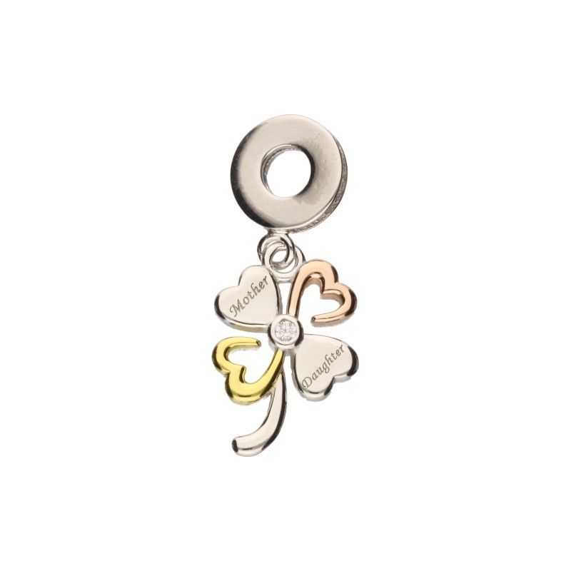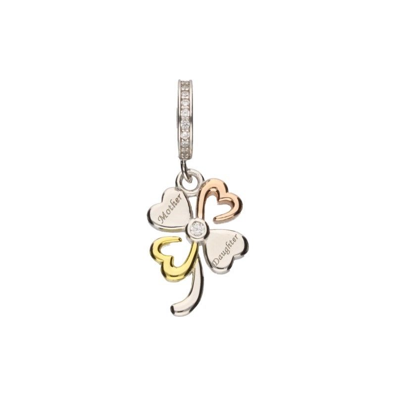 ANHÄNGER IN PERLENFORM, PASST ZU MODULARARMBÄNDERN MIT EINEM MAX. DURCHMESSER VON 3 mm, EINE KOMBINATION AUS 925er SILBER, RHODIUMBESCHICHTET UND 24K VERGOLDET UND ROSA VERGOLDET, WEISSE ZIRKONS, VIERBLÄTTRIGES KLEEBLATT