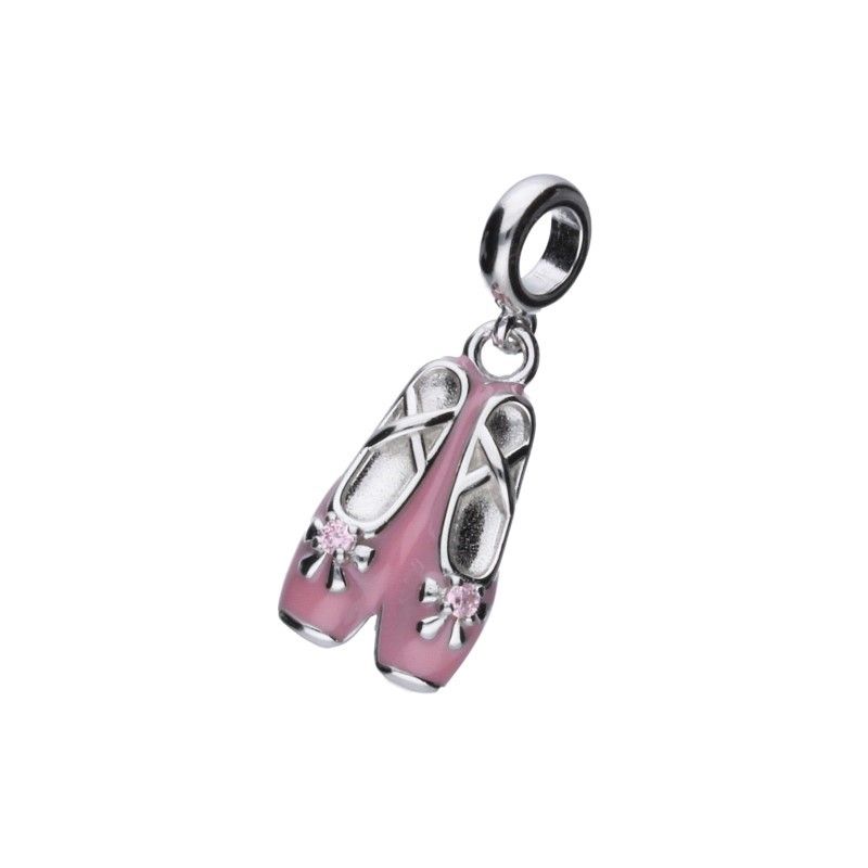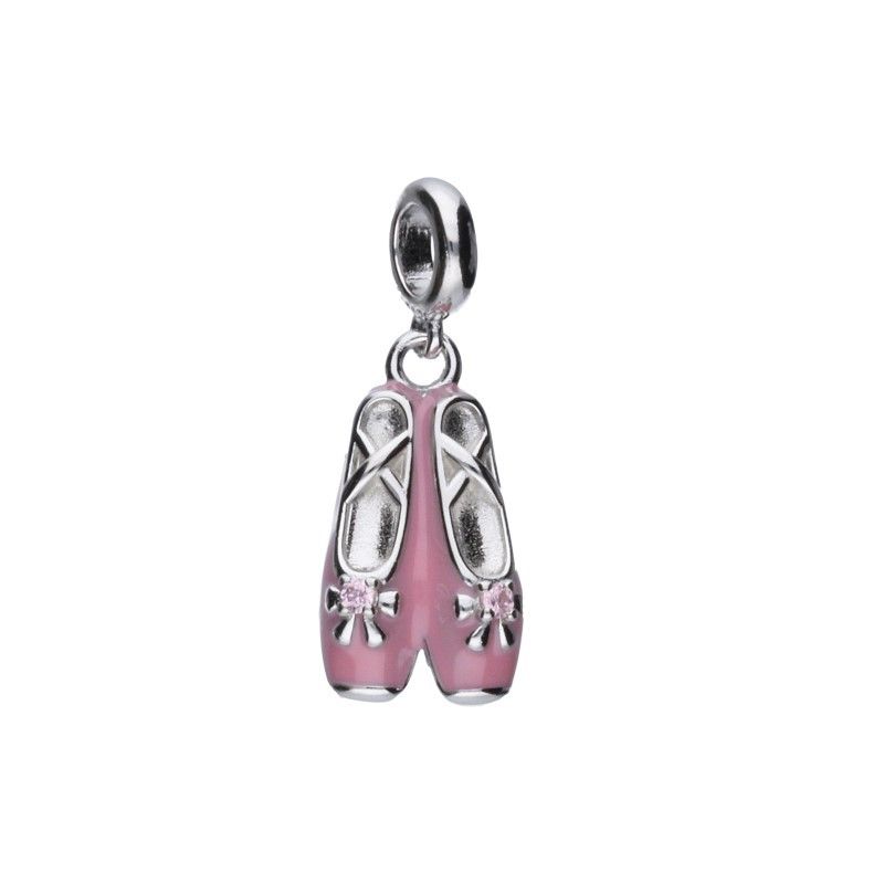 PERLEN-HÄNGEANHÄNGER, PASST FÜR MODULARE ARMBÄNDER MIT EINEM MAX. DURCHMESSER VON 3 mm, 925er SILBER, RHODIUMBESCHICHTET, ROSA ZIRKONIA, ROSA EMAILLE, BALLETTSCHUHE.