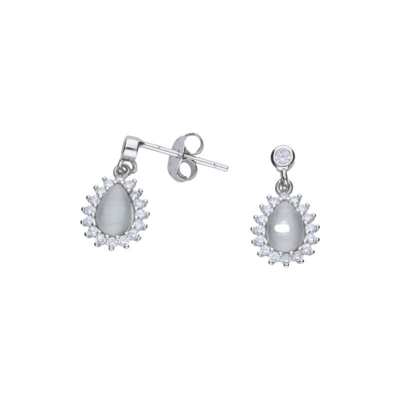HÄNGENDE STAB-OHRRINGE, 925 SILBER RHODINIERT, WEISSER ZIRKONIA, PERLMUTT, TRÄNE, MANDEL, GRÖSSE 8 mm x 9 mm.