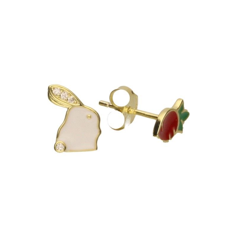 Ohrstecker aus 925er Silber, 24 Karat vergoldet, bunte Emaille, weiße Zirkone, Karotte, 5 mm x 8 mm, und ein Kaninchen, ein Hase, 6 mm x 9 mm.