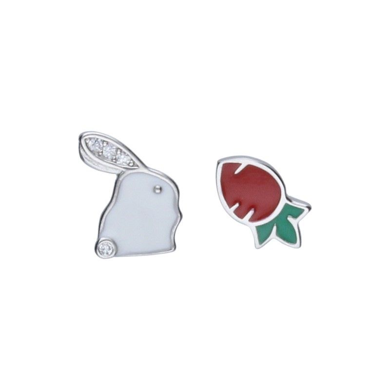 OHRRINGE AUF STÜCKEN, 925 SILBER RHODIUMBESCHICHTET, BUNTE EMAILLE, WEISSES ZIRKONIA, KAROTTE MIT ABMESSUNGEN 5 mm X 8 mm UND KANINCHEN, HASE MIT ABMESSUNGEN 6 mm X 9 mm.