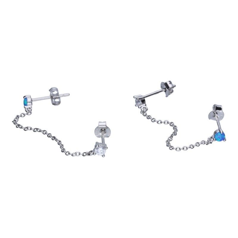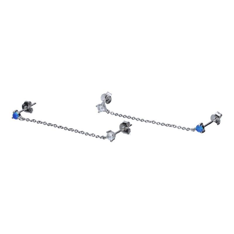 OHRRINGE AN PFOSTEN, VERBUNDEN MIT EINER KETTE, 40 mm lang, 925er SILBER, RHODIUMBESCHICHTET, BLAUER OPAL PLUS WEISSER ZIRKONIA, 3 mm DURCHMESSER.