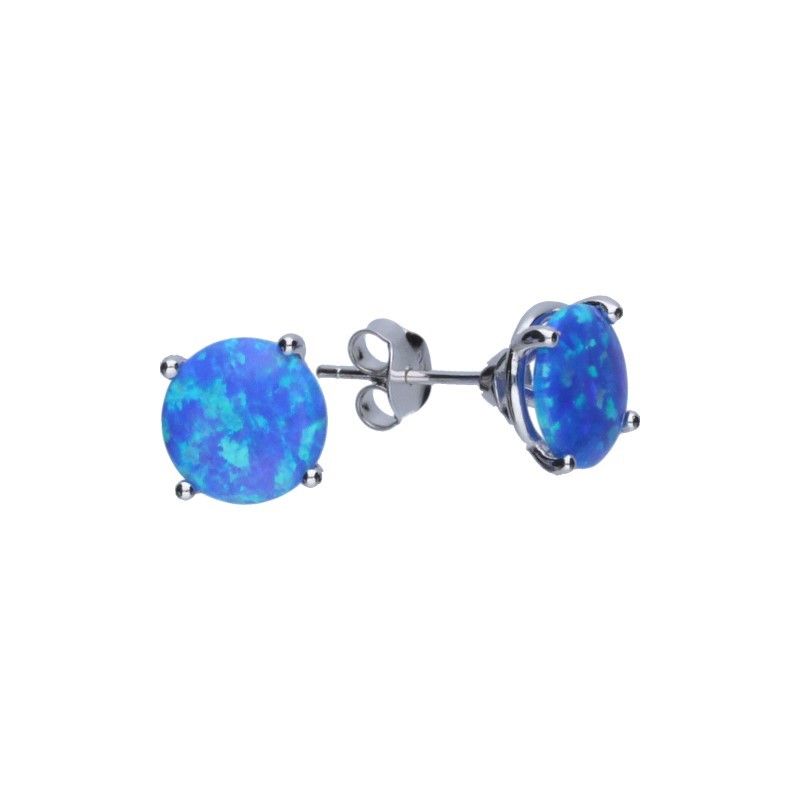 Ohrstecker aus 925er Silber, rhodiniert, runder blauer Opal, eingefasst in Silberkugeln, Durchmesser 9 mm.