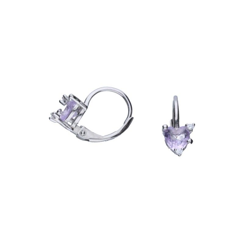 OHRRINGE MIT FRANZÖSISCHER KLEMME, 925 SILBER, RHODIUMBESCHICHTET, ZIRKONIA IN LAVENDEL UND KLEINES ZIRKONIA IN WEISS, HERZENGRÖSSE 5 mm x 5 mm.