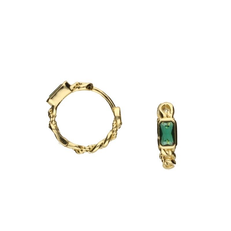 DURCHGEBRACHTE OHRRINGE, RÜSTUNGSGEWEBE, 925er SILBER VERGOLDET MIT 24 KARAT GOLD, HAUPTSTEIN SMARAGD, GRÖSSE 4 mm X 6 mm, OHRRINGDURCHMESSER 15 mm. BREITE