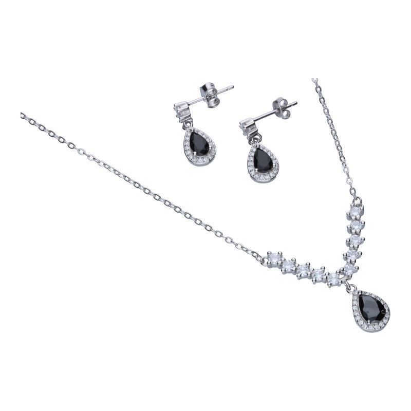 MARQUISE-SET, HALSKETTE UND HÄNGENDE OHRSTECKER, 925 SILBER RHODINIERT, WEISSER UND SCHWARZER ZIRKONIA, HALSKETTENLÄNGE 42 cm + 3 cm VERLÄNGERUNG.
