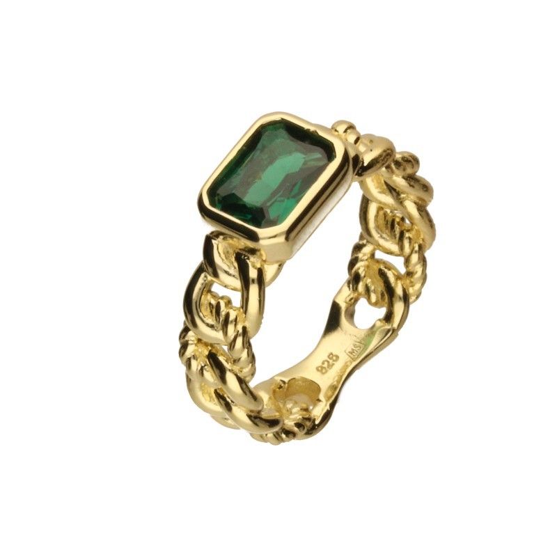 925er Silberring, vergoldet mit 24 Karat Gold, weißem Zirkon, Panzergeflecht, Smaragdfarbener Stein, Größe 8 mm x 10 mm.