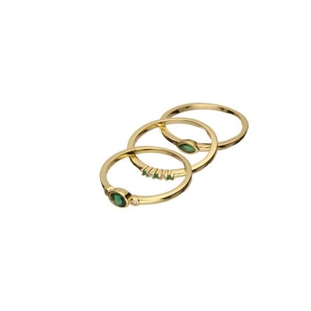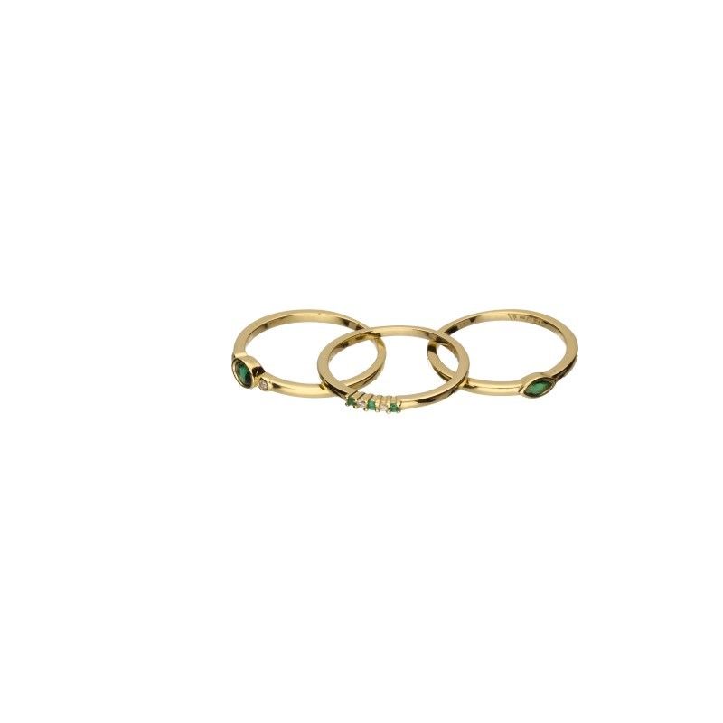 SET AUS DREI RINGEN, 925 SILBER VERGOLDET MIT 24 KARAT GOLD, WEISSEM UND SMARAGD-ZIRKONIUM, GRÖSSE 4 mm x 5 mm UND 3 mm x 5 mm.