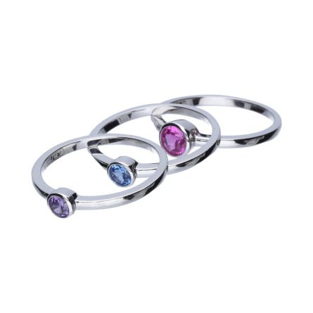 SET AUS DREI RINGEN, 925 SILBER, RHODIUMBESCHICHTET, RUNDER ZIRKONIA IN FUCHSIA, AMETHYST UND AQUAMARIN, MIT EINEM DURCHMESSER VON 4 mm UND 5 mm.