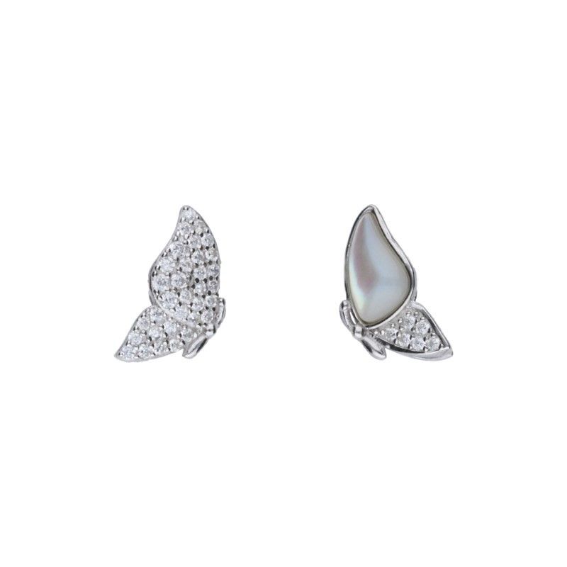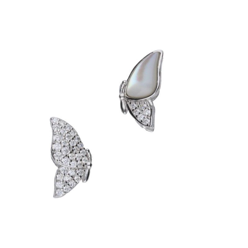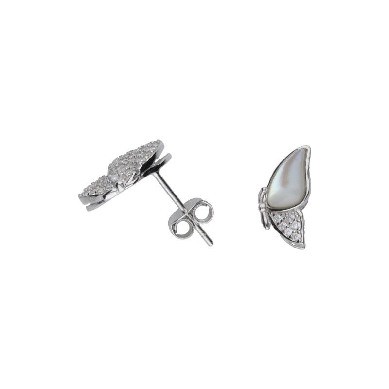 OHRRINGE AUF STÄBCHEN, 925 SILBER, RHODINIERT, WEISSER ZIRKONIA, PERLMUTT, SCHMETTERLING, OHRRINGABMESSUNGEN 6 mm x 12 mm.