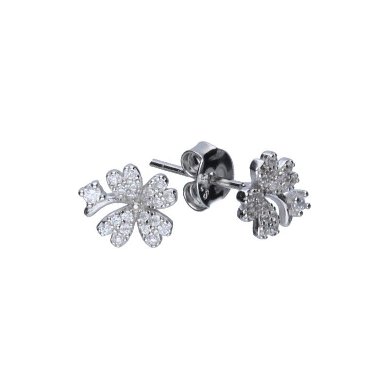 OHRRINGE AUF STÄBCHEN, 925 SILBER, RHODINIERT, WEISSER ZIRKONIA, VIERBLÄTTRIGES KLEEBLATT, OHRRINGABMESSUNGEN 7 mm x 8 mm.